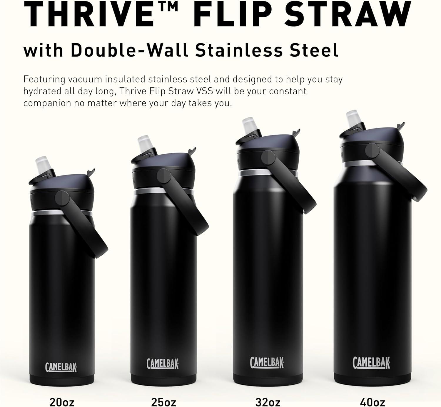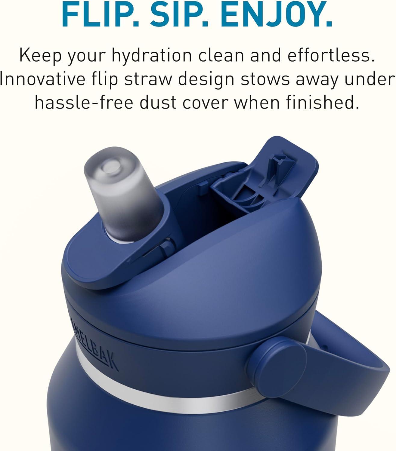 Stay hydrated all day with the CamelBak Thrive Flip Straw Insulated Stainless Steel Water Bottle. Designed for performance and convenience, this bottle features vacuum insulation to keep drinks cold without condensation. The flip straw design allows for easy sipping and includes a dust cover to protect the silicone valve from dirt and debris. A leak-proof lid and spill-resistant straw ensure mess-free hydration, while the integrated protective bumper adds grip and guards against dents. The comfortable carry handle and sweat-proof exterior make it ideal for travel, gym, and outdoor use. Durable, easy to clean, and built for adventure, this bottle is your go-to for everyday hydration.
