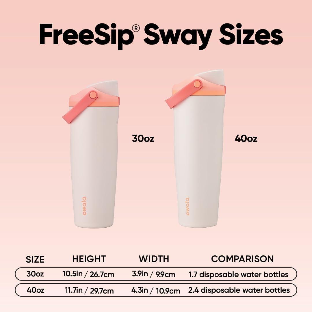 Designed for living life to the fullest, the Owala FreeSip Sway is like our original FreeSip—with even more travel-friendly features. In addition to our patented 2-in-1 FreeSip spout (you know, the one with the built-in straw and open swig option), this 40oz stainless steel water bottle holds plenty of water without being oversized. The sturdy bucket handle makes it easy to grab and go—not to mention comfy to hold. The tapered shape fits pretty much anywhere you’d stash a bottle, including most cupholders—whether it’s your car or your spin bike. The triple-layer insulation keeps drinks cold for up to 24 hours, and the sweat-proof exterior means no slippery hands or water rings.The wide-mouth opening makes cleaning easy and adding ice even easier. Plus, it’s made with BPA-free, durable materials. Sway is the ultimate hydration companion that goes with the flow of your day. It’s the ultimate gift for anyone who needs to up their hydration game. (Yourself included.).