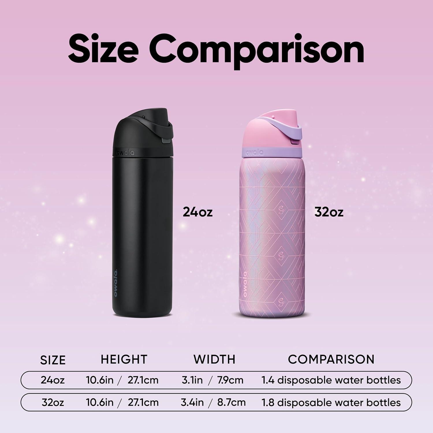 The Owala FreeSip Insulated Stainless-Steel Water Bottle with Locking Push-Button Lid easily tackles every thirst. With a built-in, easy-clean straw and a wide-mouth opening, the FreeSip reusable bottle is designed for drinking two different ways: sipping upright through the straw or tilting back to swig from the wide-mouth spout opening. Add in a push-to-open lid and playful colors, and staying hydrated has never been simpler—or more fun. Additional features include double-wall insulated stainless steel that keeps drinks cold up to 24 hours, a carry loop that doubles as a lock, and a wide opening for easy cleaning and adding ice. The Owala FreeSip Insulated Stainless-Steel Water Bottle with Locking Push-Button Lid is available in three sizes: 24-Ounce, 32-Ounce, and 40-Ounce. Lid is dishwasher safe; hand wash cup. Not for use with hot liquids. Manufacturer’s limited lifetime warranty.
