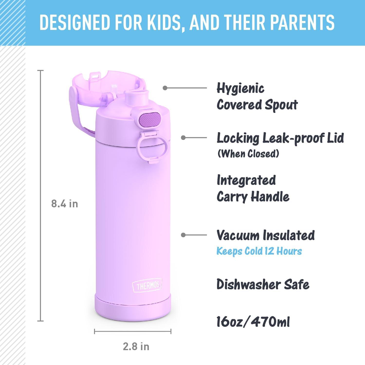 The FUNtainer® 16-ounce Vacuum Insulated Stainless Steel Water Bottle with Spout keeps drinks cold for up to 12 hours. Our kids water bottles are built so their drinks are as cool on the inside as they look on the outside. Kids stay hydrated and parents stay happy. The double wall stainless steel construction is built to handle drops, dings and assorted roughhousing. Includes an integrated carry handle with soft-touch grip, making it easy for kids to carry with them throughout the day. Help keep germs away with the hygienically covered drinking spout. To clean, you can pop your FUNtainer water bottle in the dishwasher; however washing by hand is recommended. Not for use with hot liquids.