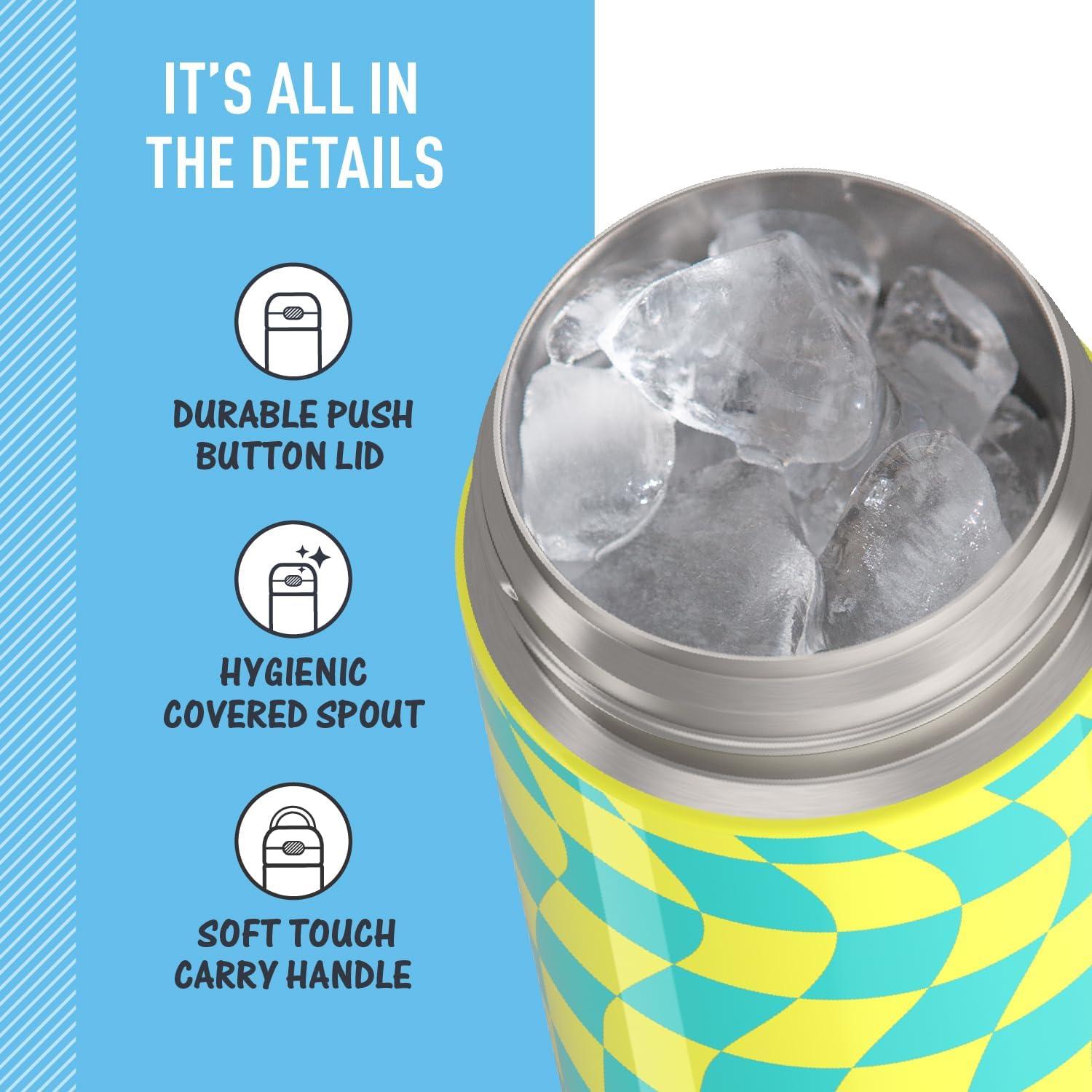 The FUNtainer® 16-ounce Vacuum Insulated Stainless Steel Water Bottle with Spout keeps drinks cold for up to 12 hours. Our kids water bottles are built so their drinks are as cool on the inside as they look on the outside. Kids stay hydrated and parents stay happy. The double wall stainless steel construction is built to handle drops, dings and assorted roughhousing. Includes an integrated carry handle with soft-touch grip, making it easy for kids to carry with them throughout the day. Help keep germs away with the hygienically covered drinking spout. To clean, you can pop your FUNtainer water bottle in the dishwasher; however washing by hand is recommended. Not for use with hot liquids.
