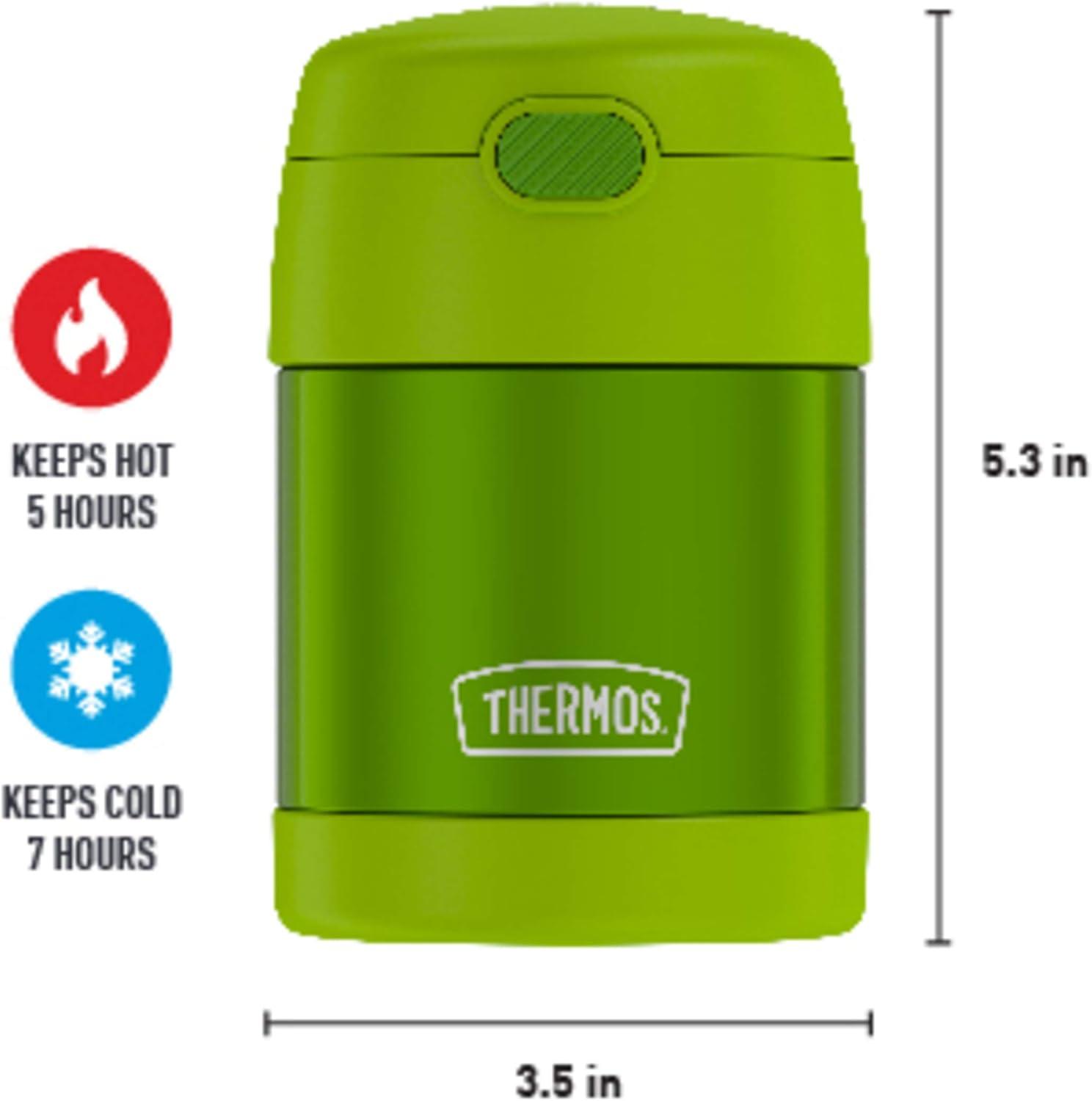 The 10oz FUNtainer® Food Jar from Thermos® brand is vacuum insulated to keep hot foods hot and cold foods cold-and since it's designed for kids it's also colorful and fun. Send them to school with their favorite soup so they can enjoy it fresh and hot at lunch time. If they're in the mood for a cold snack, pack it up with yogurt and berries, or apples and peanut butter. The FUNtainer food jar is light weight and compact with a push button lid so it’s easy to carry and open. To clean, you can pop your FUNtainer food jar in the dishwasher; however washing by hand is recommended. Spoon included.