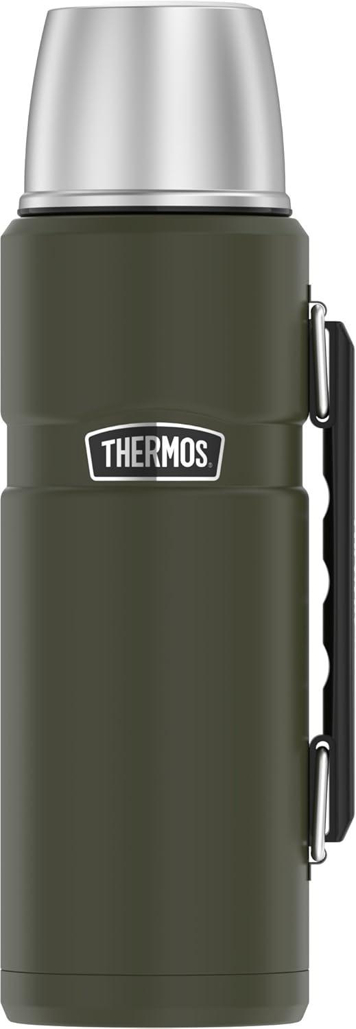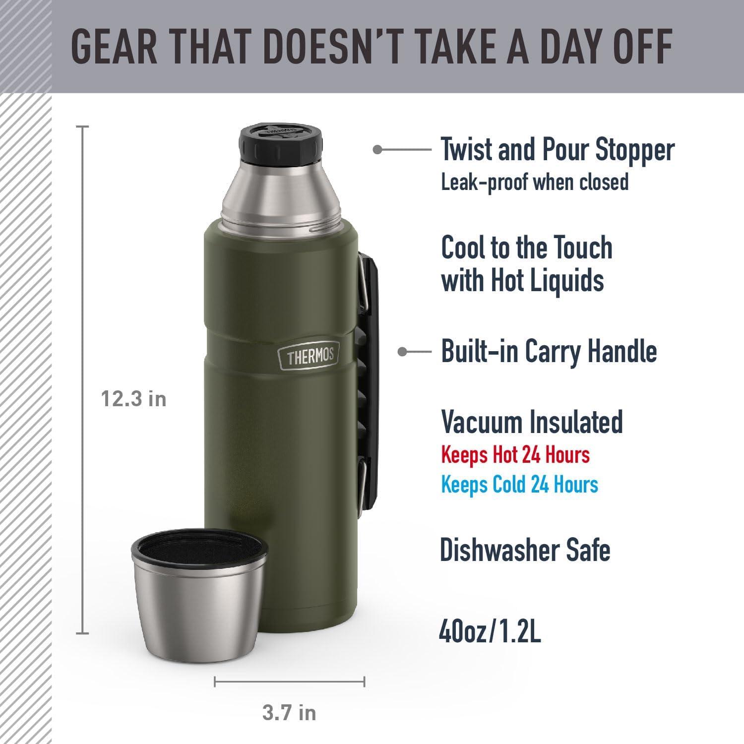 This STAINLESS KING 40oz Beverage Bottle is the perfect take-along for family camping and outdoor enthusiasts. The handy serving cup doubles as a lid. High quality 18/8 stainless steel construction is dependable any time of year for long treks or road trips. The twist and pour stopper feature means easy pouring and a tight seal. Not only will it keep your favorite beverages hot or cold for 24 hours, but 40oz of volume means serving the whole family is a breeze. Exterior stays cool to the touch with hot beverages and sweat-proof with cold. THERMOS brand beverage bottles are dishwasher safe, top rack recommended. Your new companion for every outdoor adventure.